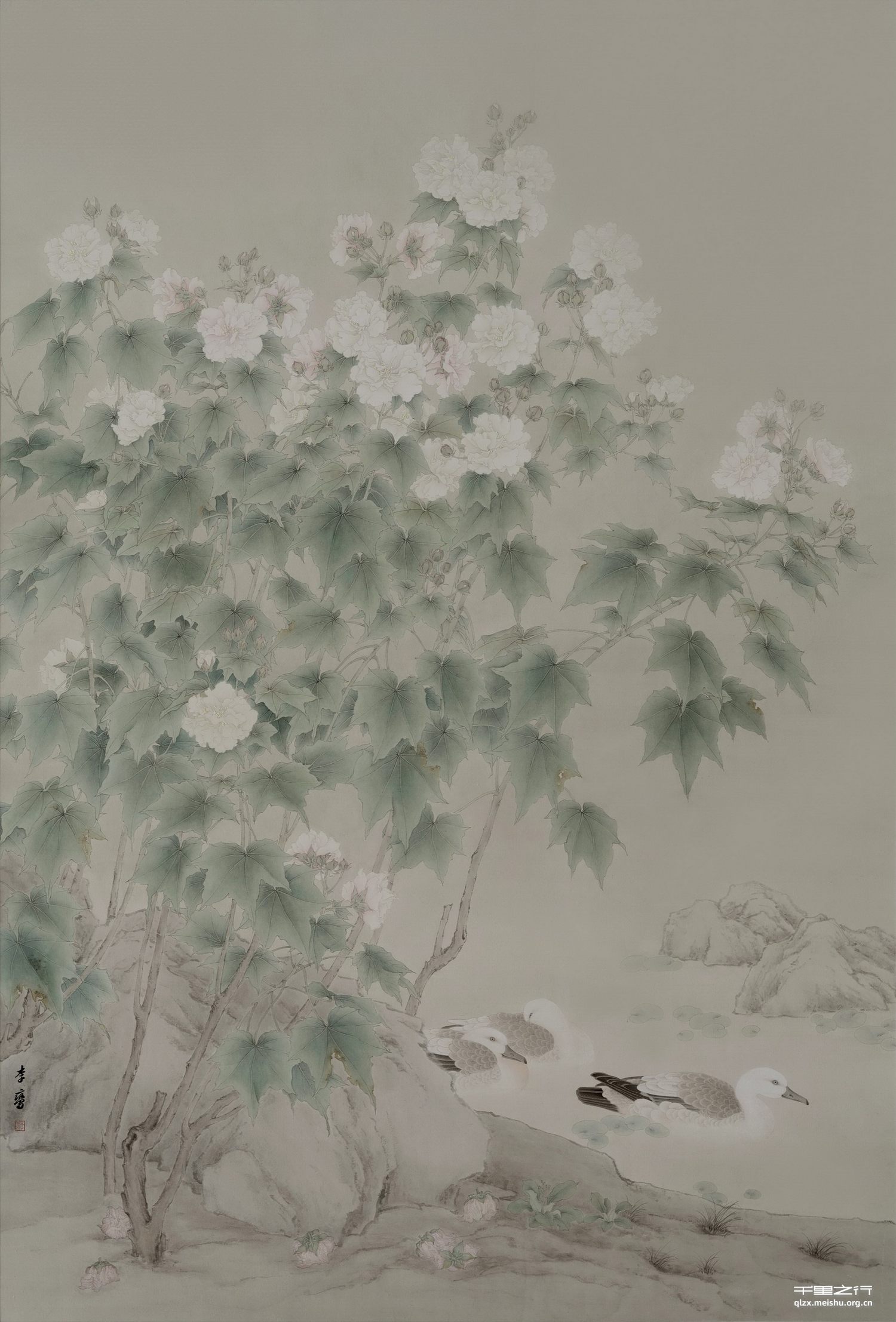 “新开寒露丛,远比水间红。”初见木芙蓉是在红楼梦中,当时就感叹他的柔韧,只可惜不能表达分毫。2021年有一个偶然的机会去成都天府芙蓉园写生,心中甚是欣喜,当时正值雨季,常常能够见到雨水打湿芙蓉花的场景,花瓣娇艳欲滴,极其动人。我画了很多写生,回来后整理、组织成了这幅作品,希望能表达出自己内心的感受。