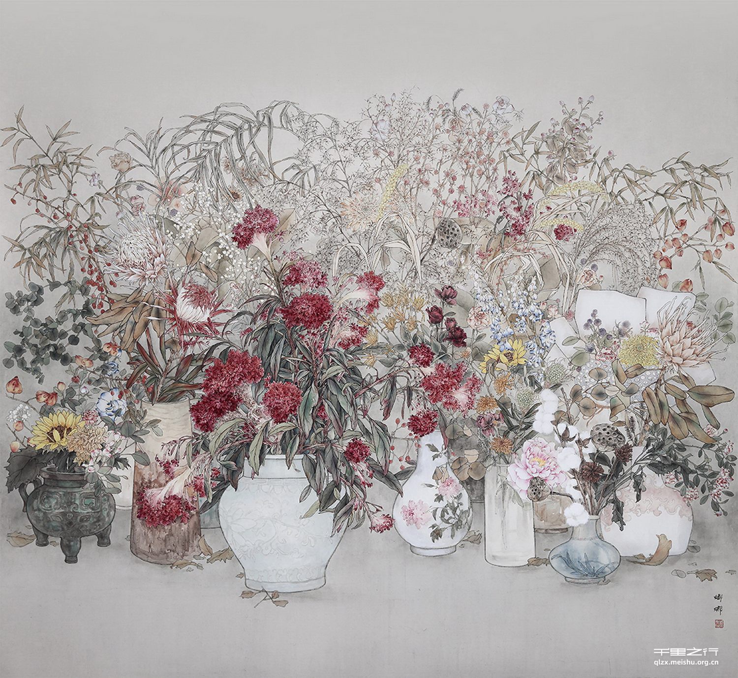 干花是定格时光下的冲动,是一种柔和的美,衰败的美,沉淀的美,倔强的美。这是一种经历过春日的萌芽,夏日的绽放,秋日的洗礼,冬日的滋养与光阴的沉淀,从而蕴含着第二次春天朝露的希翼。虽所画题材是看似枯萎的干花,但它内在生命力与柔和而坚韧的风骨是我所想表达的。正如当下的心境,希望在疫情退去之后,我们依旧可以从心焕发生气。面对生活,更加沉稳从容、积极乐观。