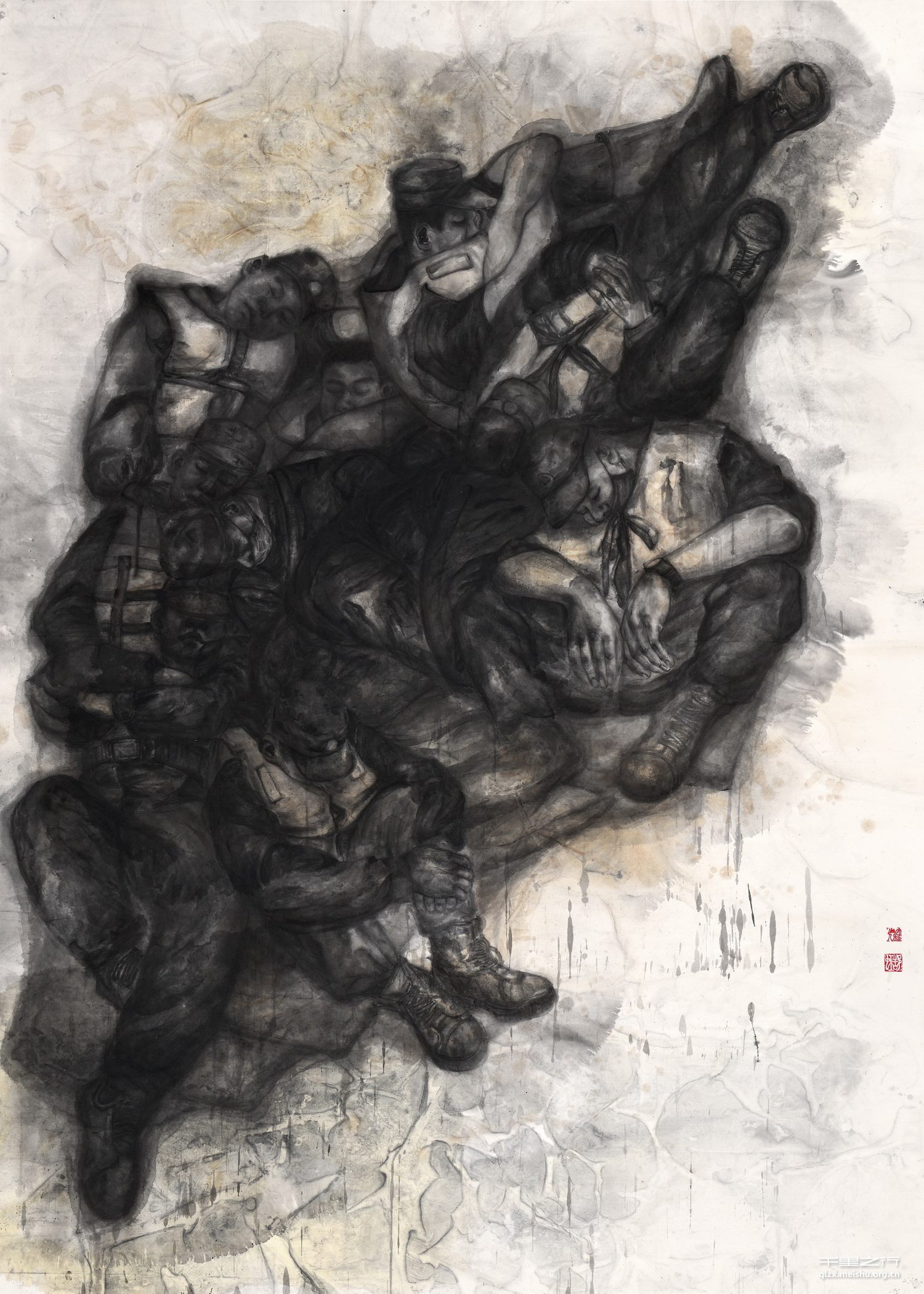画面借助积墨、泼墨等水墨写意表现手法,描绘了解放军战士在与洪水猛兽搏斗的间隙瘫倒在一起休息的场景。构图整体浑厚,注重形式感,用笔大胆直率,尽力塑造抗洪战士的人物丰碑感,他们坚实的背影将印刻在历史的长河中熠熠生辉,流长….流长……